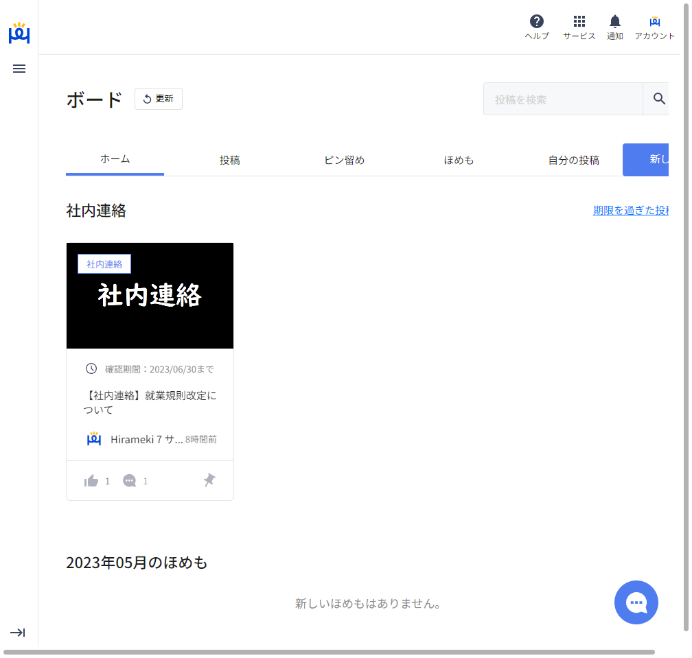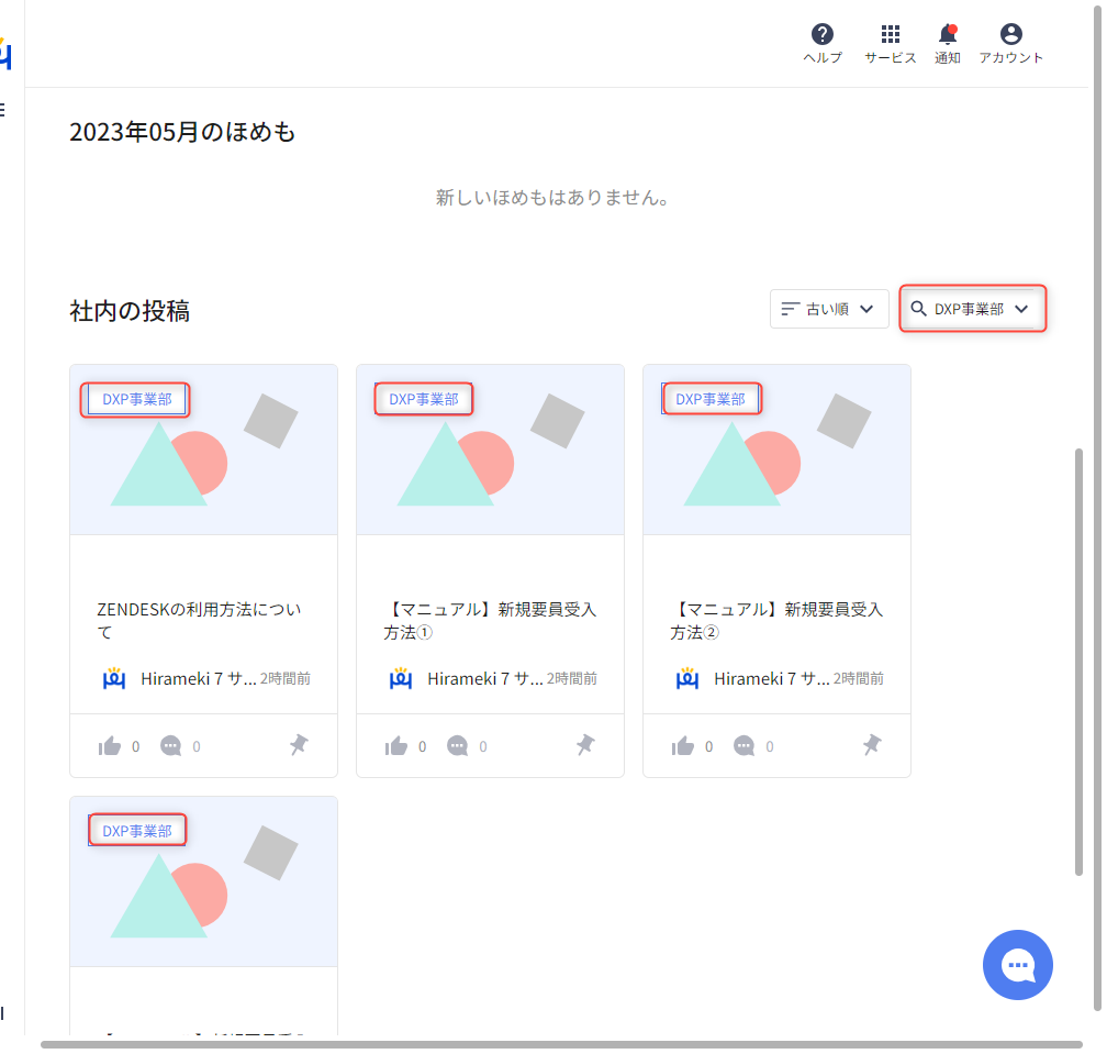 このカテゴリの機能を使い、例えば「業務マニュアル」などのカテゴリを作成し、そちらに簡単な業務マニュアルを掲載したり、部署ごとにカテゴリを作成し部署毎の共有事項を投稿するなどの使い方も可能です。また、表示されるカードには画像を設定できますので、カテゴリ毎、部署毎、投稿される内容毎に設定する画像を決めて運用すると視覚的にもわかりやすい使い方ができます。