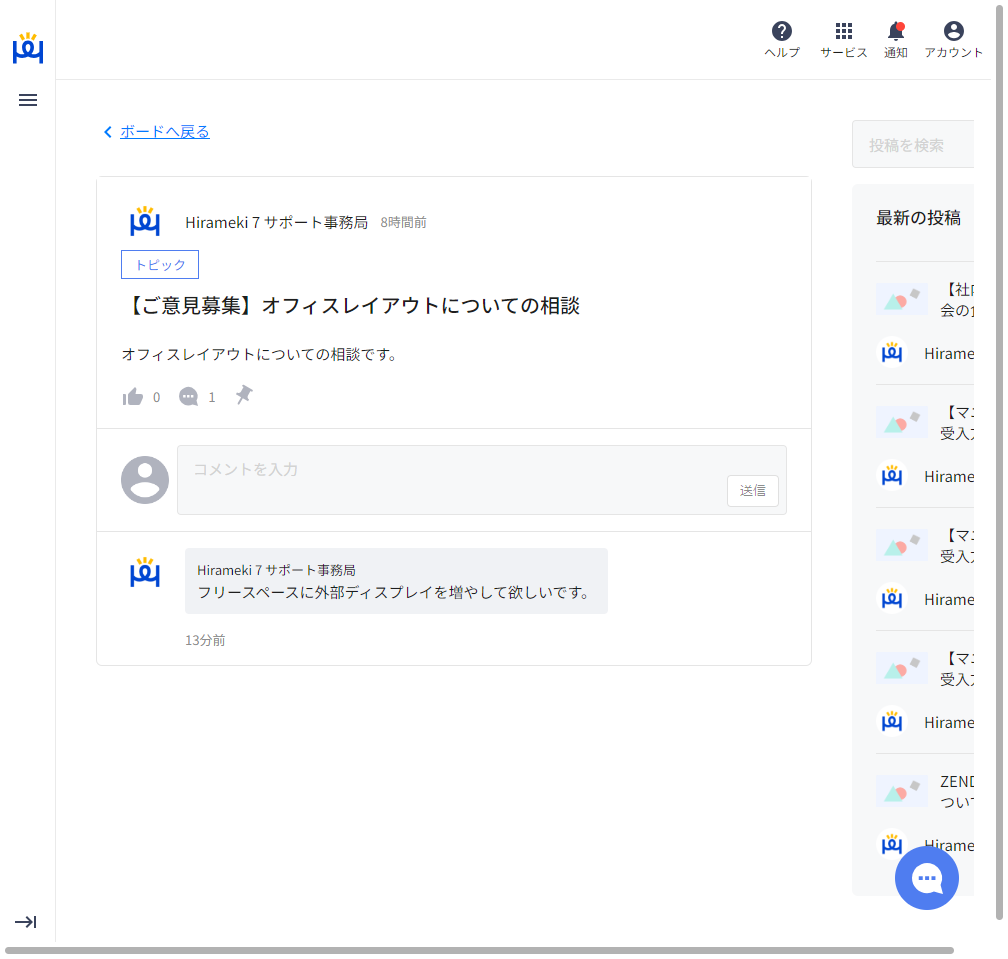 コメント機能を使ったコミュニケーションについては、SNSなどでよく見るコメント機能と同様に、投稿に対して各人がコメントを残すことができます。例えば、選択肢のある問いかけではなく、自由記述式での意見を求めるときなどは、コメント機能をつかって意見を募集することに利用することも可能です。