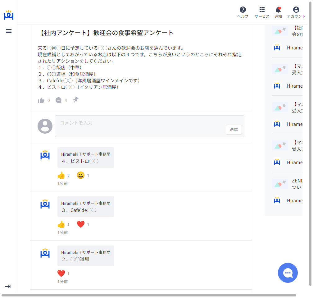 リアクション機能を使ったコミュニケーションでは、コメントとは違いYes/Noあるいは選択式の問いかけをする場合に有効です。例えば、社内イベントでの食事についてアンケートを取ったり社内イベントへの参加者確認などにも使うことが可能です。