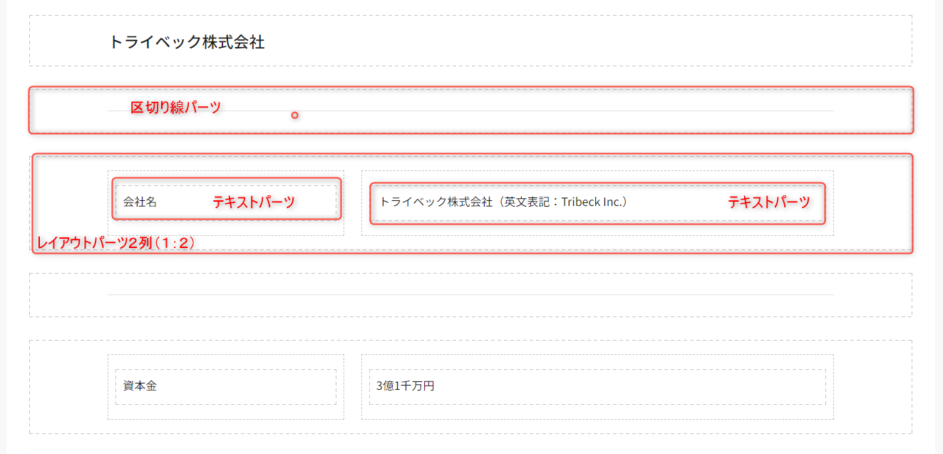 このような企業情報を作成する場合、Hirameki 7では「レイアウトパーツ」「テキストパーツ」「区切り線パーツ」を使って再現することができます。