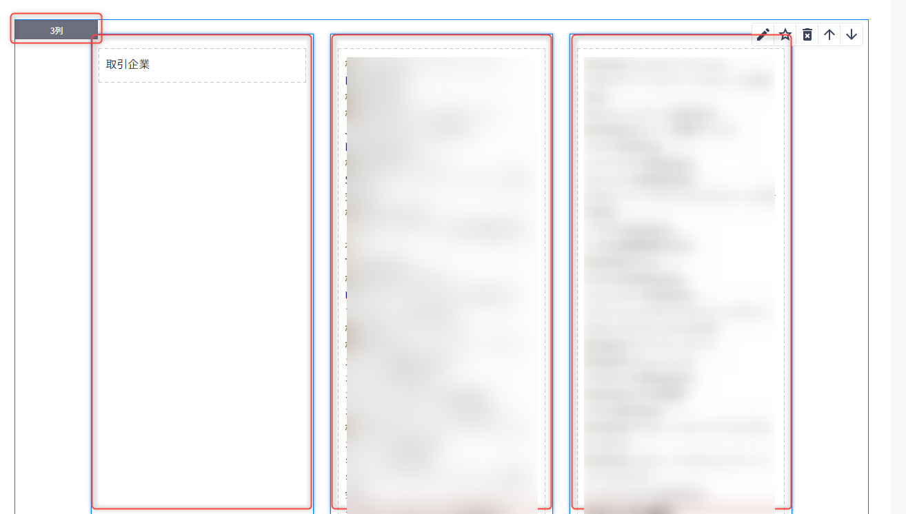 表示したい情報の種類や、表現、文章量などによってレイアウトパーツの種類や幅の比率、余白を余白パーツを使って調整いただくと良いでしょう。例えば、「取引先企業一覧」のように数が多くなる情報は、2列のレイアウトパーツではなく、3列のレイアウトパーツを利用すると縦長になり過ぎず、スッキリしたページにすることができます。
