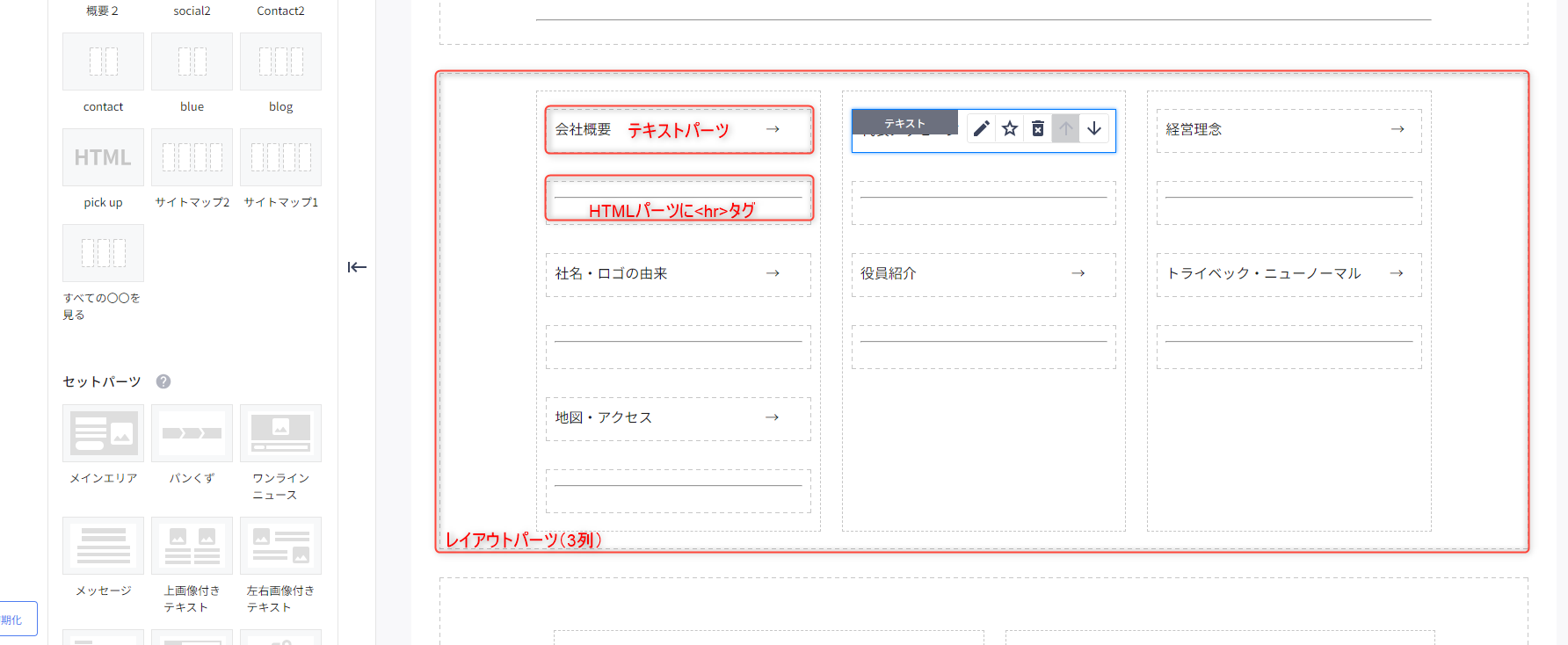 お手本とする部分は、テキストと区切り線で構成されていますので、「テキストパーツ」「HTMLパーツ」そして、横並びに配置するために「レイアウトパーツ(3列)」を使って作成します。