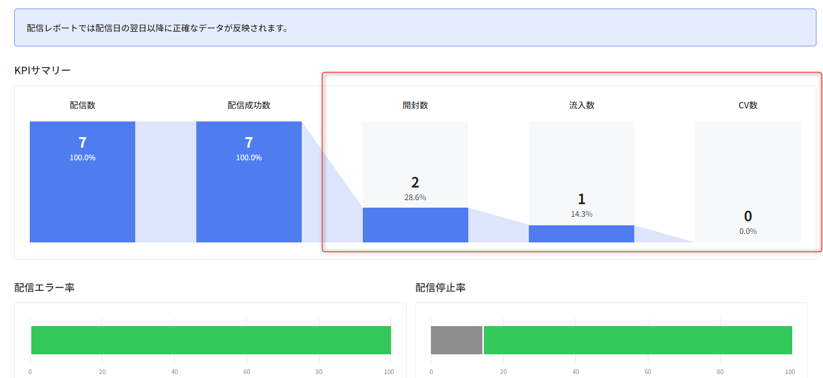 「配信数」、「配信成功数」、「開封数」、「流入数」、「CV数」が確認できます。このうち、「流入数」「CV数」については、メール本文内にHirameki 7で作成したWebサイトやフォームを設置したページへのリンクが設定されている必要があります。また、「開封数」については、HTMLメールのみ対応可能です。