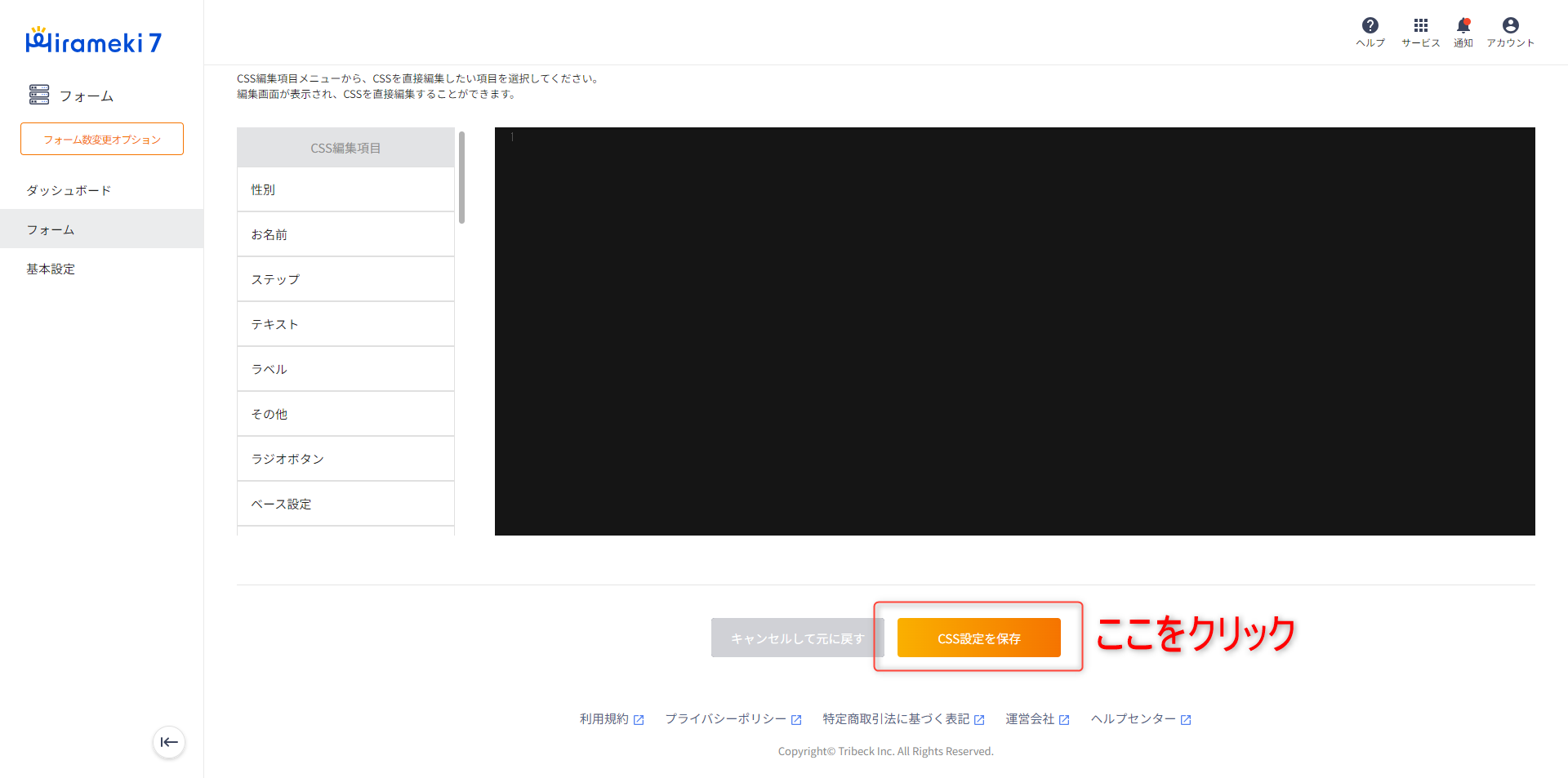 CSS編集画面が表示されますので、この画面で下部に表示される「CSS設定を保存」をクリックします。