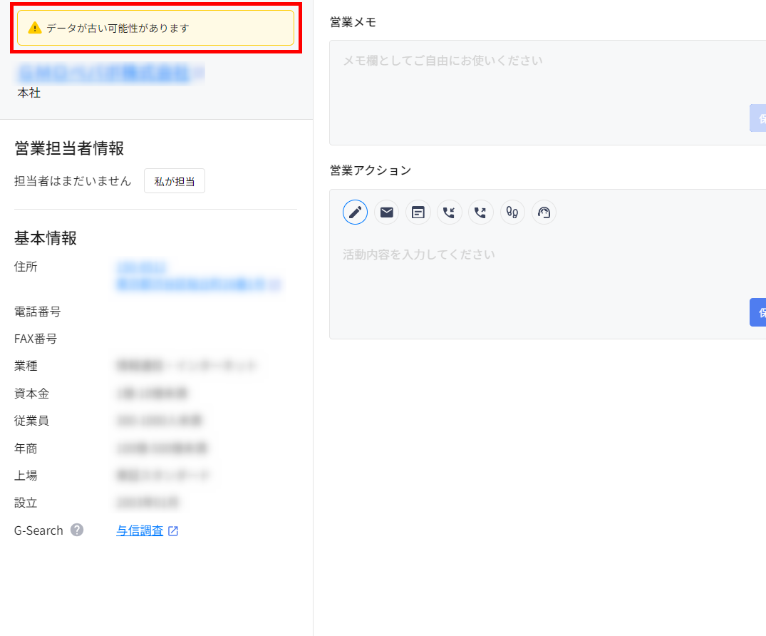 検索でヒットした企業を「営業リスト」に登録すると、検索当時の企業情報がリストに保持されます。それ以降に住所変更などがあり、リストに保存された”当時の情報”と”現在提供する情報”に差分が生じている場合、企業情報を開くとこのようなメッセージが表示されます。