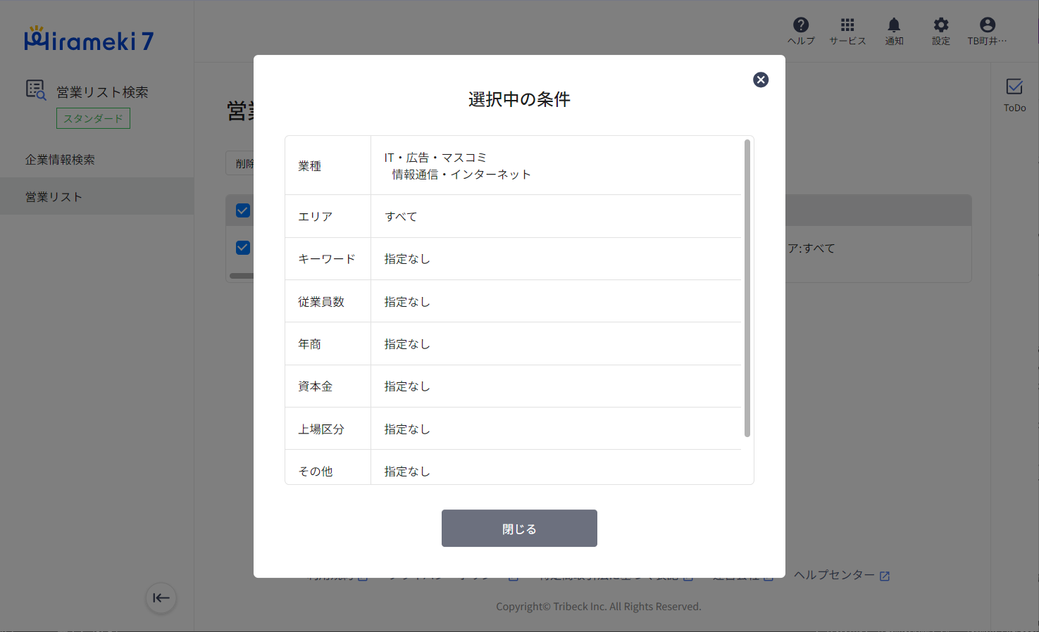 営業リストを登録した際の条件が表示されるので、同じ条件でもう一度検索を行い、新しい営業リストを登録してください。