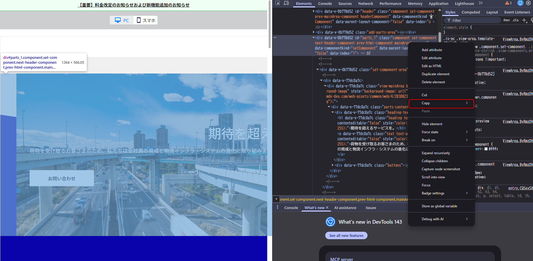 開いたデベロッパーツールの左上にあるボタンをクリックし、ソースコードを取得したいパーツが選択された状態にします。右側のソースコードの該当箇所がハイライトされるのを確認できたら、そのコードの上で右リックします。