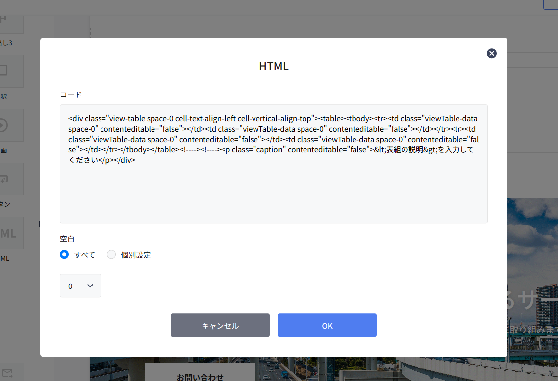 HTMLパーツに、表組みパーツのソースコードを貼付け、OKボタンを押下します。