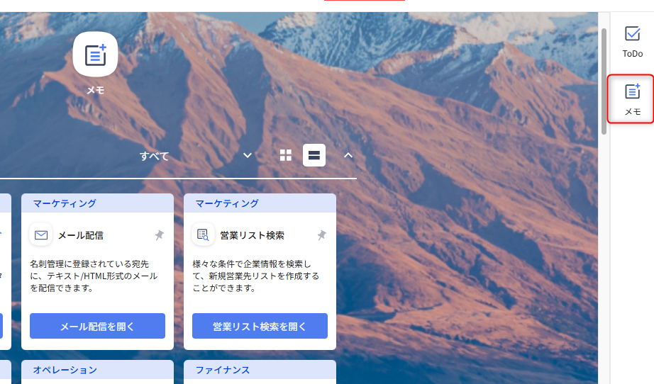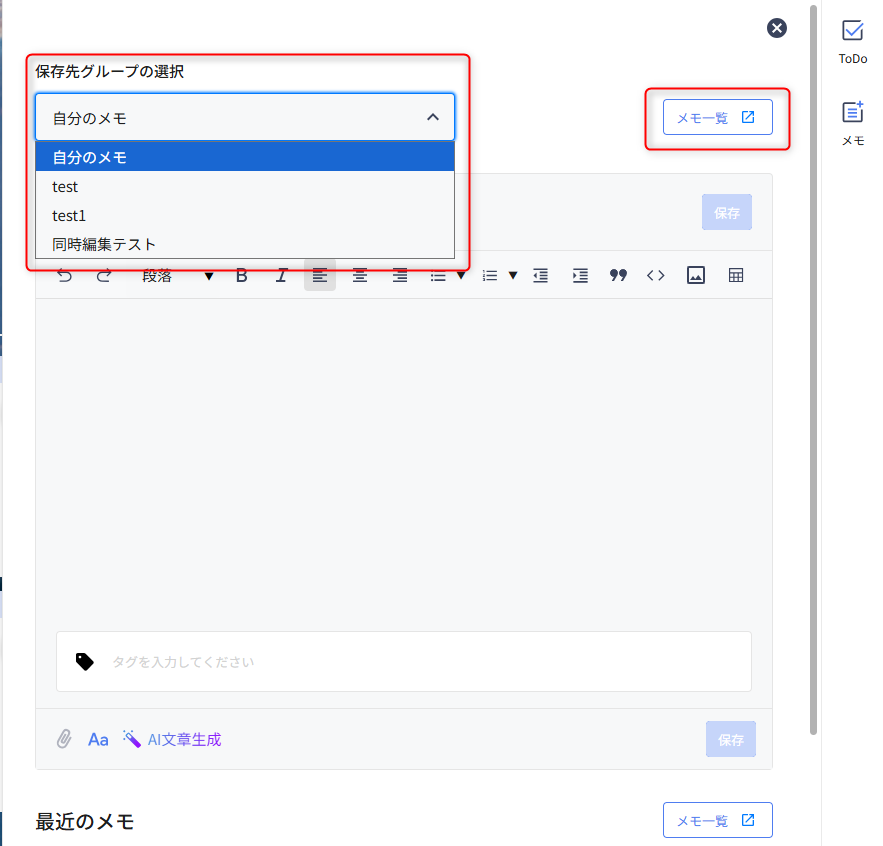 保存先グループは、「メモ」機能の画面より設定いただくことが可能です。メモ機能の画面を開くには「メモ一覧」ボタンから開くことができます。
