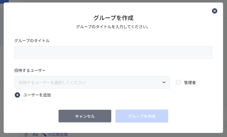 「グループを追加」ボタンをクリックすると、以下のようなモーダル画面が表示されますので、自分のみに表示させるメモグループを作成する場合には、グループタイトルを入力し招待するユーザーは選択せずに「グループを作成」ボタンをクリックします。