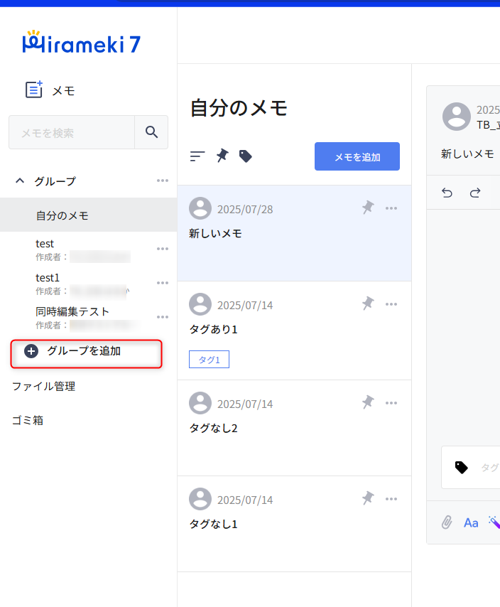メモ機能にグループを追加する場合は、左側のメニューにある「グループを追加」をクリックします。