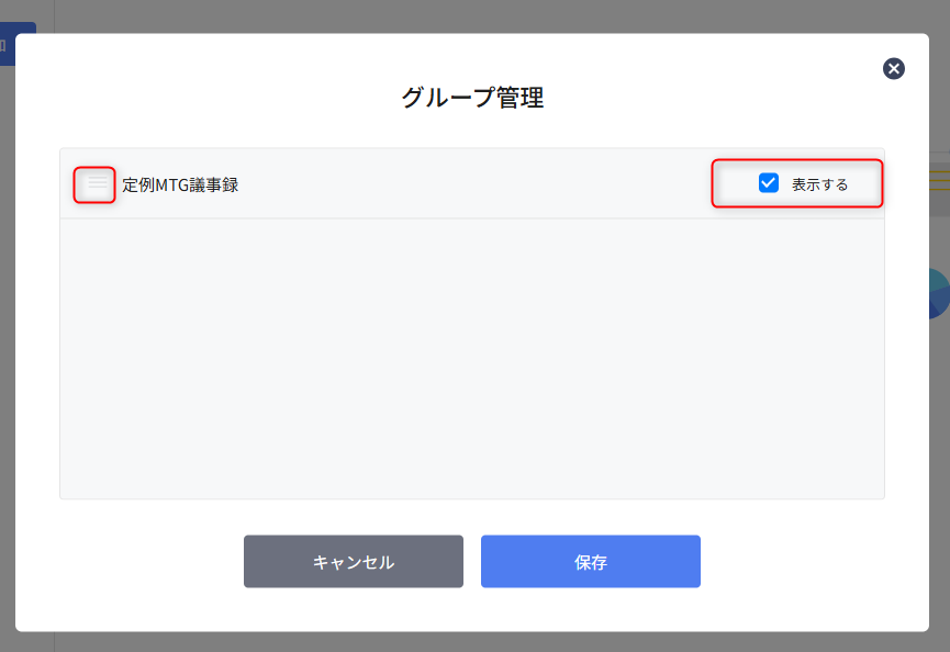 グループ管理画面では、表示/非表示だけでなく、表示順を変更することもできます。表示/非表示はグループ名の右にあるチェックボックスにより変更いただけます。表示順はグループ名の左側をドラッグ&ドロップで入れ替えることができます。