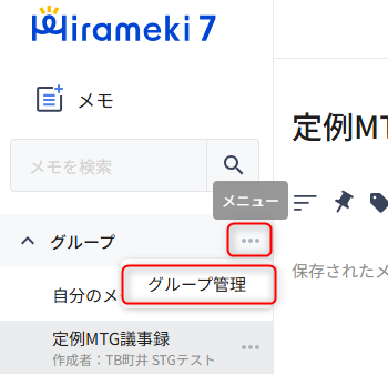 作成されたグループはメモ画面の左側のメニューに表示される「・・・」メニューをクリックすると表示されます。グループの名称変更(管理者のみ)や参加中のメンバーの追加(管理者のみ)および削除、非表示化、削除(管理者のみ)が行えます。グループを選択した状態で、「メモを追加」ボタンをクリックすると、新たなメモを追加することができます。