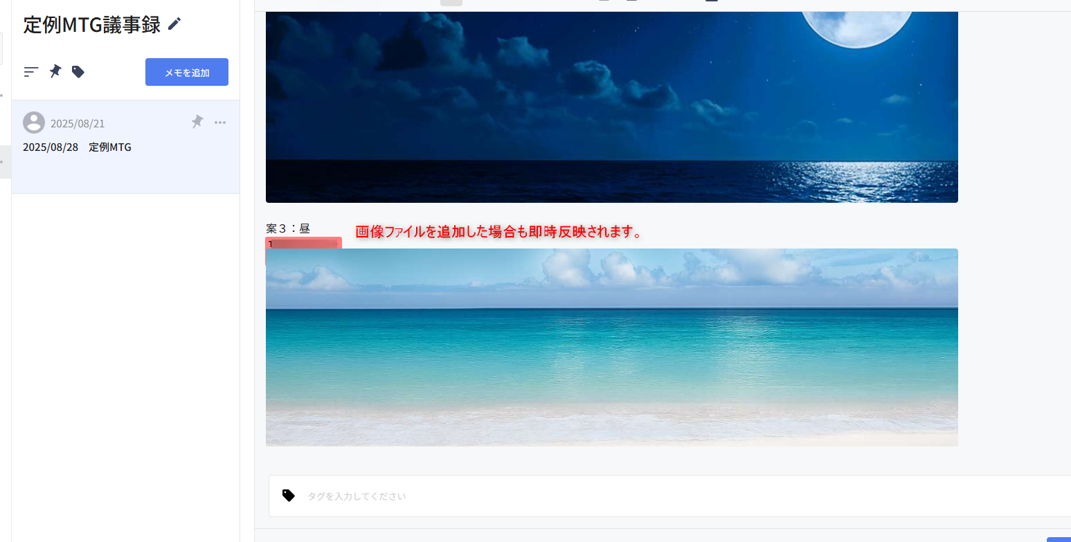 同時編集画面では、それぞれのメンバーが入力しているラインにメンバー名が表示され、だれがどの部分を編集しているかを確認することができます。また、ファイルを添付した場合は保存されるまで反映されませんが、メモ内に画像ファイルを貼り付けた場合は、画像ファイルの表示は即時反映されます。