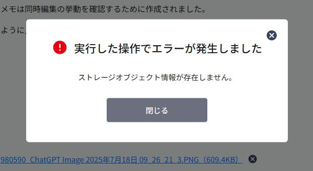 同時編集時には、メモ欄内の変化はリアルタイムに反映するのですが、添付ファイルを追加した場合は反映されません。添付ファイルを追加した場合は、一旦保存した上で、各メンバーは読み込み直すまではアップロードされた添付ファイルは反映されませんので、ご注意ください。保存ボタンを押されたことは他のメンバーに通知されません。同時編集している際にファイルを添付した場合には、他のメンバーに声をかけてリロードしてもらいましょう。また、保存は後から保存した状態が保存されますので、自分がファイルをアップロードした後に、誰かがリロード前に保存してしまうとアップロードしたファイルが保存されていない状態で保存されることになりますので、ご注意ください。