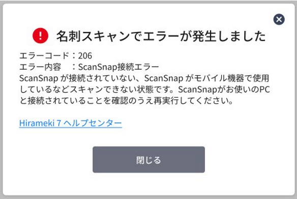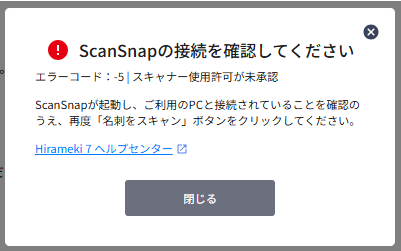 Scansnapの機器とPCの接続にエラーが発生している状態でスキャンを行うと、以下のようなエラー画面が表示されます。