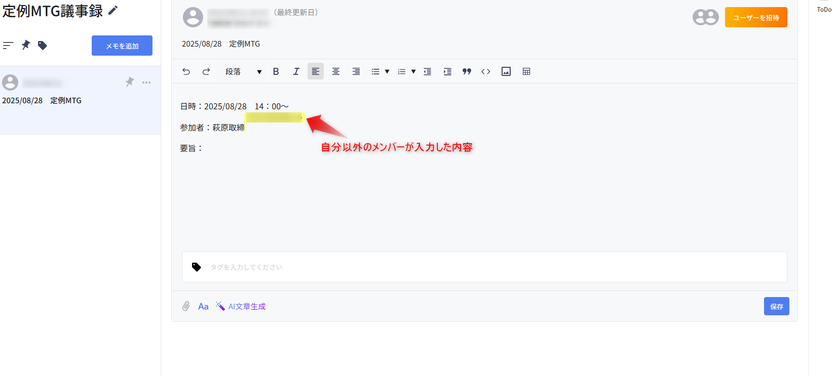 ・メモ機能におけるメンバーとのメモの同時編集