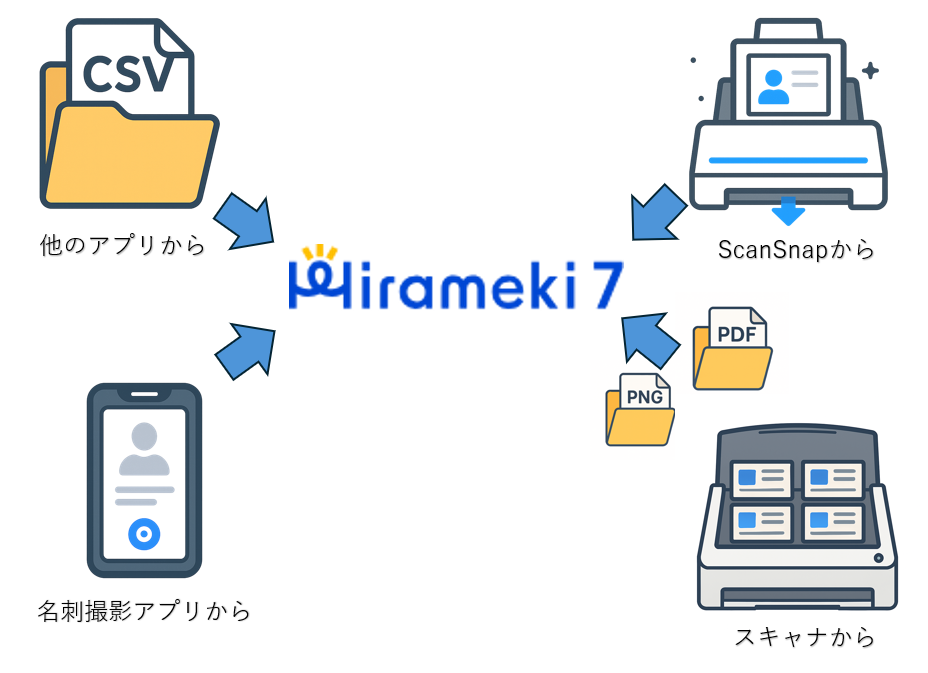 この記事では、Hirameki 7の名刺管理機能に他のアプリや、ScanSnap、名刺読み取りアプリ、スキャナなどから名刺データを取り込む方法について説明しています。4つの方法から選んで取り込むことができますが、どのような場合にどの方法を使うかに迷っている場合に、こちらのページを参考にして決定することができます。