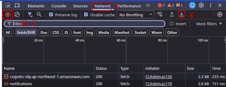 1.開発者ツールの「NETWORK」タブをクリックします。
