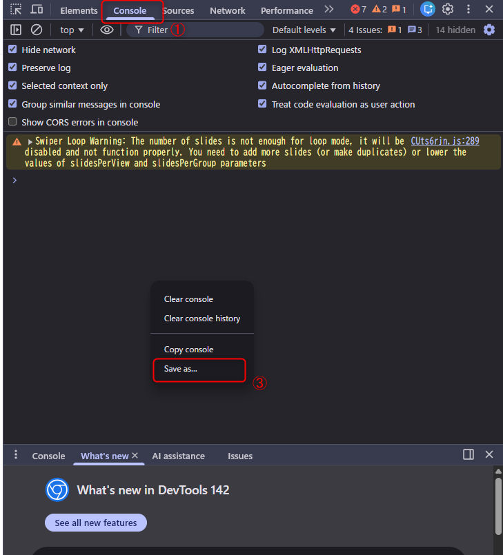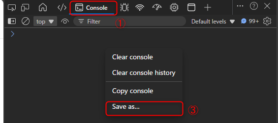 3.コンソールに何か表示される場合がありますので、そちらのどの部分でも構いませんので右クリックし、「Save as...」をクリックします。ファイル保存の画面となりますので、ファイル名はそのままに保存したファイルをサポートにご提供ください。