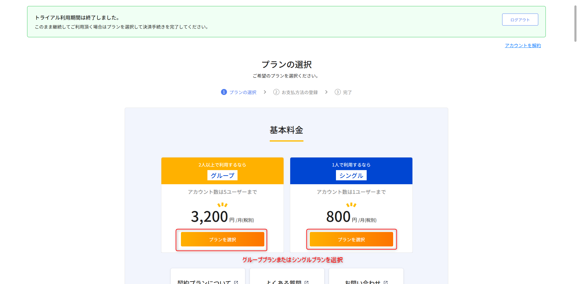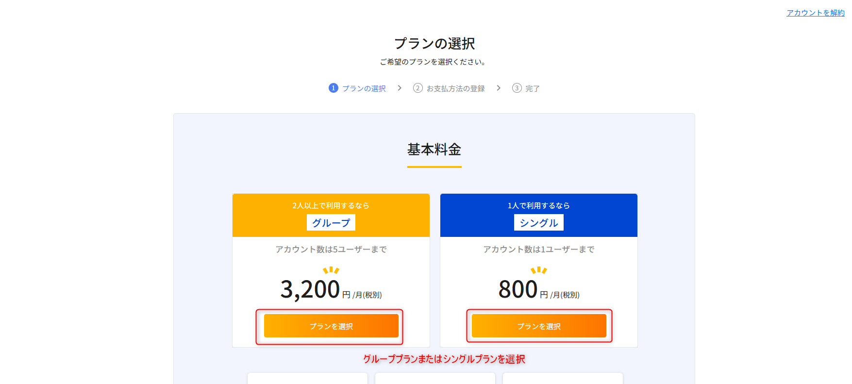 すると、プランを選択する画面が表示されますので、そちらよりプランを選択します。