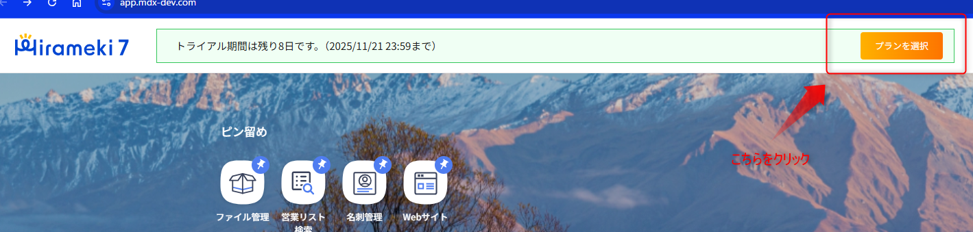 Hirameki 7のトライアル期間が終了しますと、ログイン後には以下のような画面が表示されます。