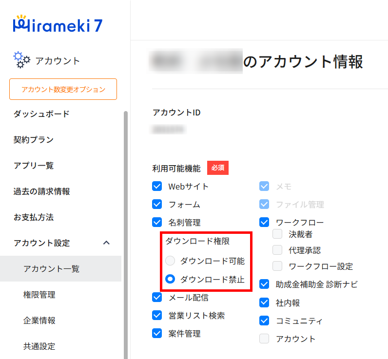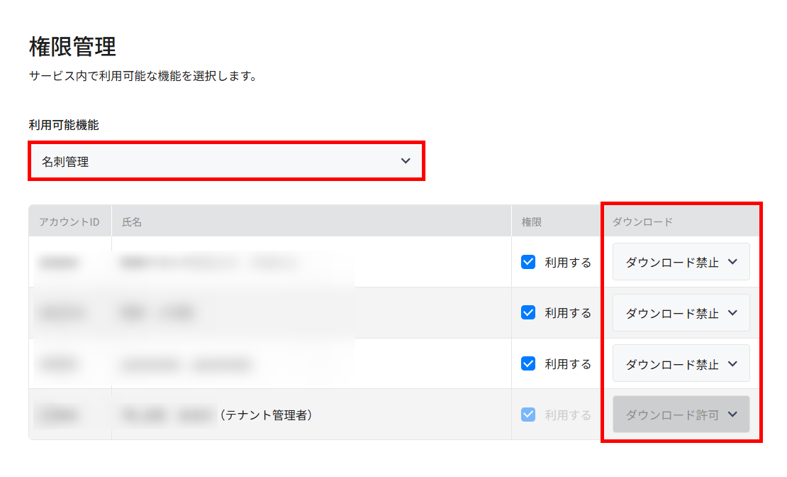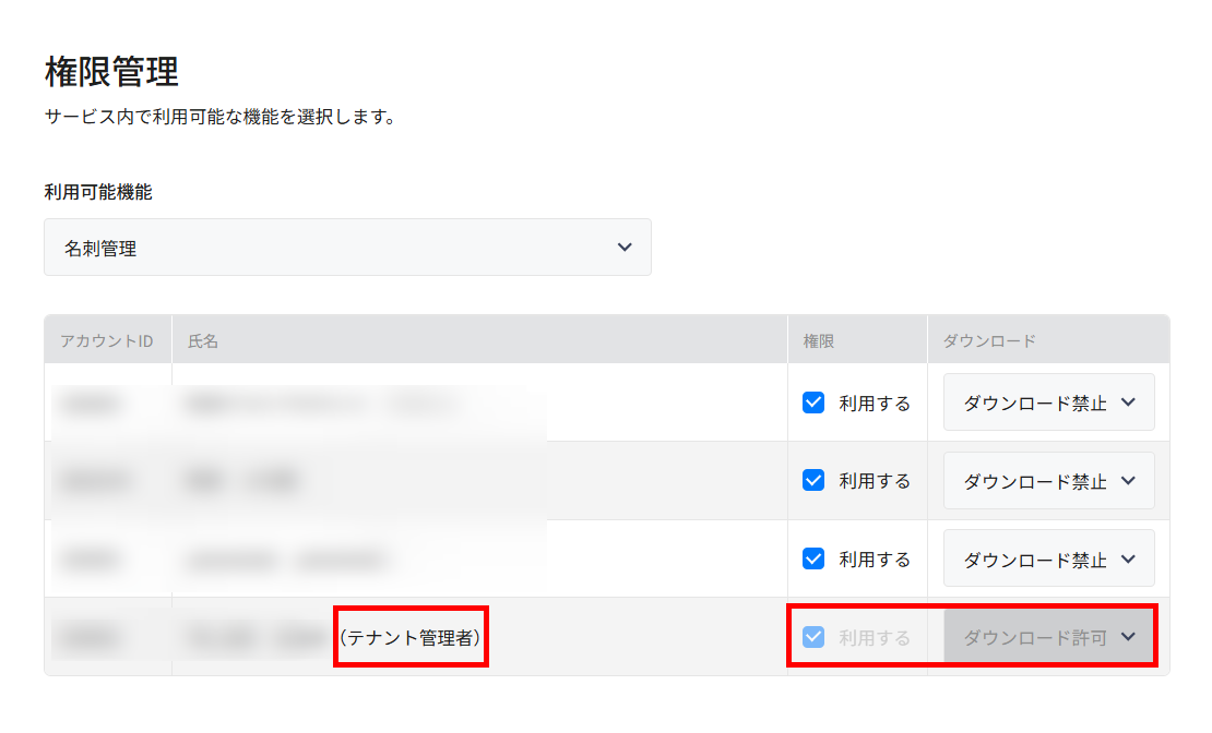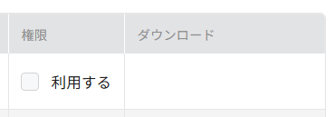 アカウントに名刺管理機能の権限が与えられていない場合は「ダウンロード」の項目には何も表示されず、ダウンロード権限を変更することができません。