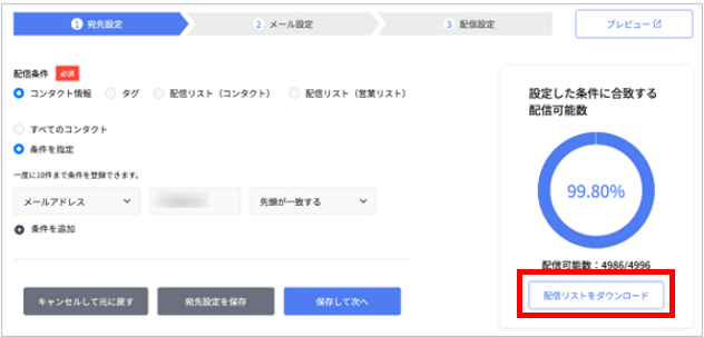メール配信機能のメール作成「①宛先設定」にて「配信リストをダウンロード」ボタンが表示され、クリックすると画面内の配信条件で指定されている配信先のリストをCSVでダウンロードすることができます。