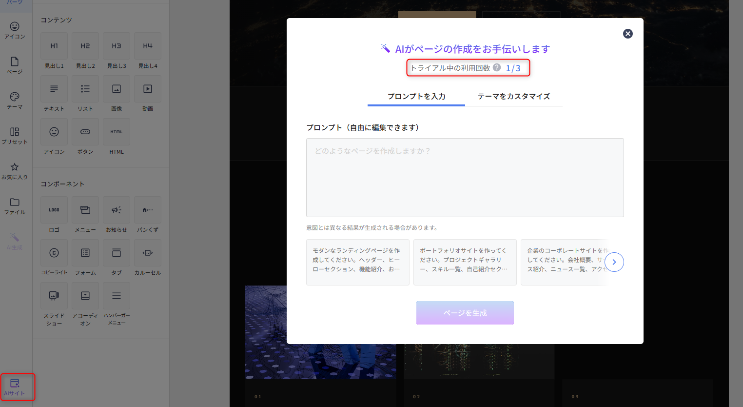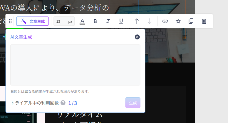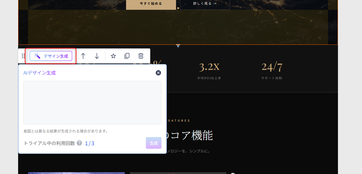トライアル中は、エディターの左下より起動する「AIサイト」機能からのAI生成と既に作成されているパーツを編集する「AIデザイン生成」や文章を生成する「AI文章生成」でも利用できます。ただし、どちらも生成される分量に関わらず1回とカウントされますので、ご留意ください。