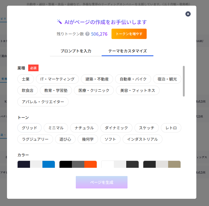 まくまで目安となりますが、AIページ生成で「テーマをカスタマイズ」を使って生成する場合、1回あたりページを生成すると大凡28,000トークンを消費します。消費されるトークンは選択する業種やトーン、既に作成されているページの内容や入力されるプロンプトによって大きく変動しますので、あくまで目安と捉えてください。