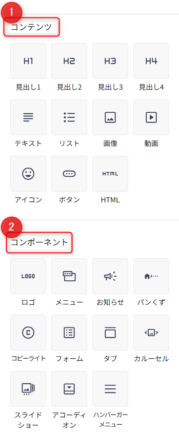 Hirameki 7のパーツでは、ドラッグまたはクリックを行うことでテキストや、画像、ロゴを追加できます。パーツは「コンテンツ」と「コンポーネント」から成り立ちます。まずはコンテンツからご紹介します。