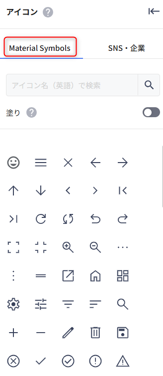 Material Symbols(Googleが提供する標準アイコンセット)をはじめ、各種アイコンをページ内に挿入できるパーツです。
