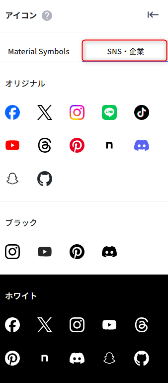 また、SNSや企業ロゴのアイコンも用意されており、お持ちのSNSアカウントURLを設定することで、各ページへリンクさせることができます。リンクボタンやフッターなどに活用できます。