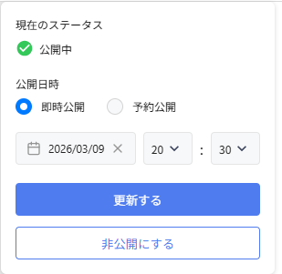 公開ボタンをクリックすると、公開中のページ、未公開ページ共に「即時公開」または「予約公開」を選ぶことができます。また、公開中のページのみ「非公開にする」ボタンをクリックすると、即時/予約で非公開化を行うことができます。 |