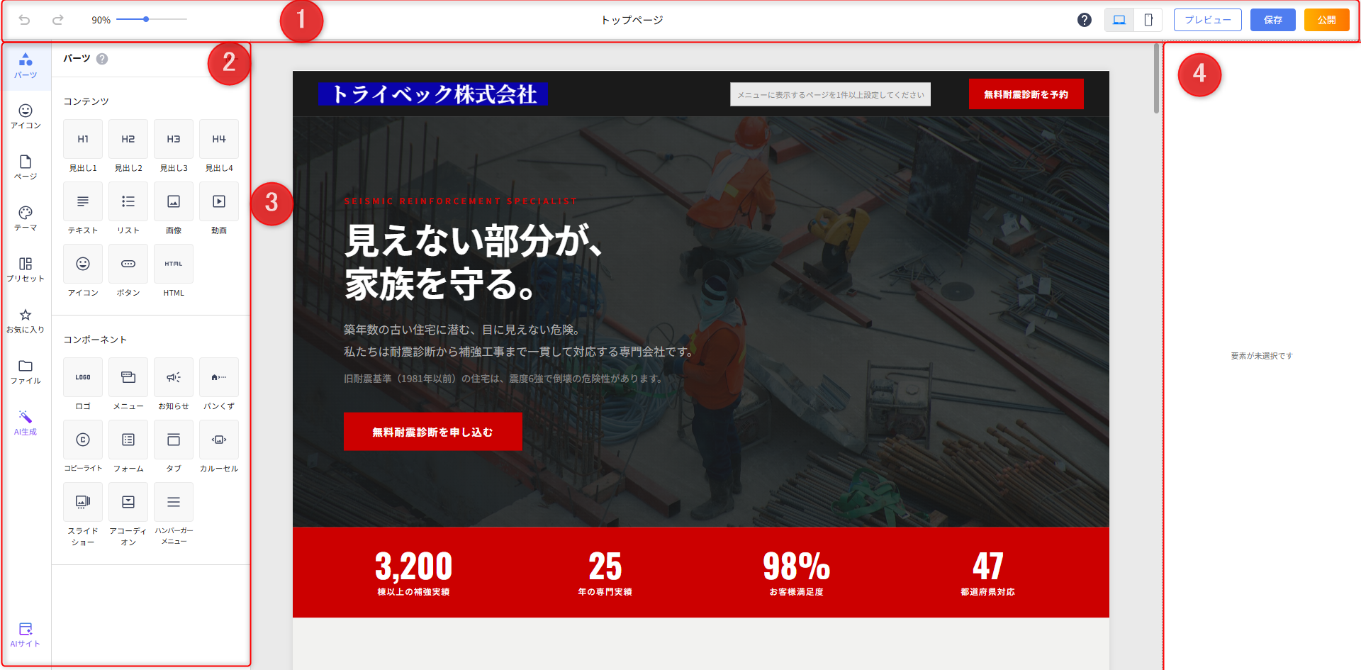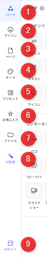 | ❷ | レフトメニュー | レフトメニューでは、ページ内に配置するパーツや、アイコン、テーマやプリセット、AI関連メニューを開くことができます。 |