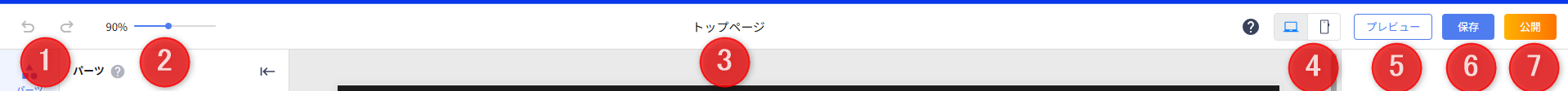 | ❶ | トップメニュー | トップメニューでは、エディター内のUndo(取消)/Redo(再やり直し)、拡大/縮小、PC表示/スマホ表示切替、プレビュー、保存、公開処理が行えます。 |