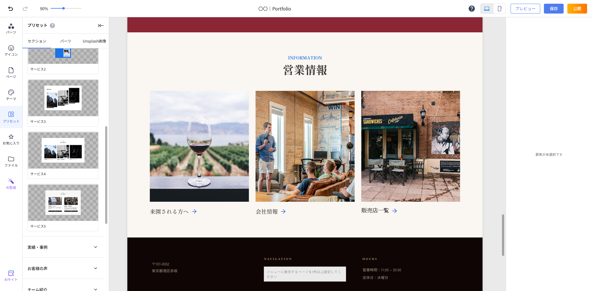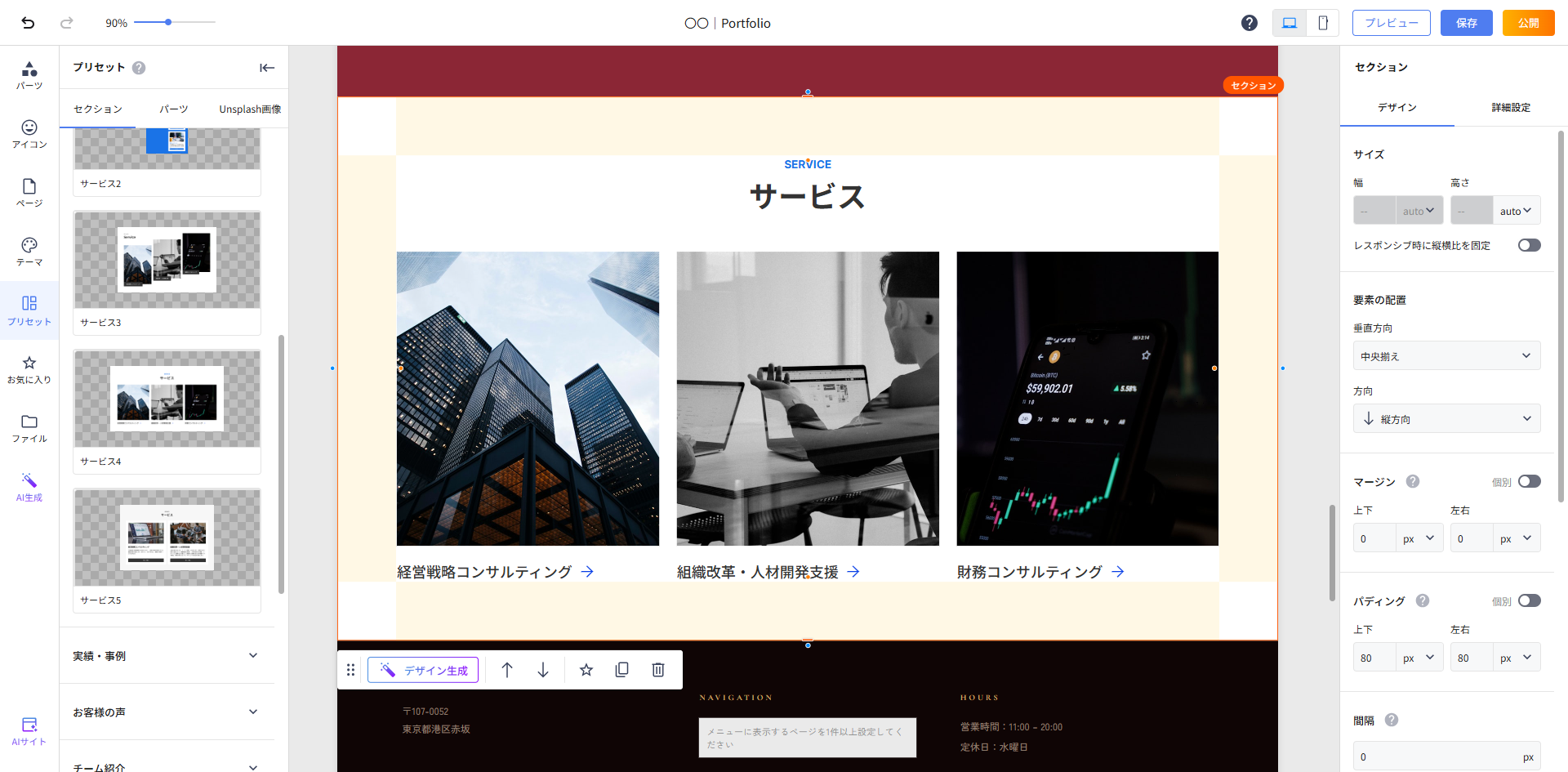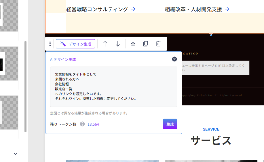 プリセット内の「サービズ紹介」内に同じ構成のプリセットがありましたので、追加します。追加した上で、表示される「デザイン生成」をクリックして、以下のようにAIに指示を出します。