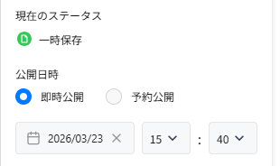 エディターの右上にある「公開」ボタンをクリックすると、「即時公開」か「予約公開」か選択画面が表示されますので、どちらを選んで「公開」ボタンをクリックします。