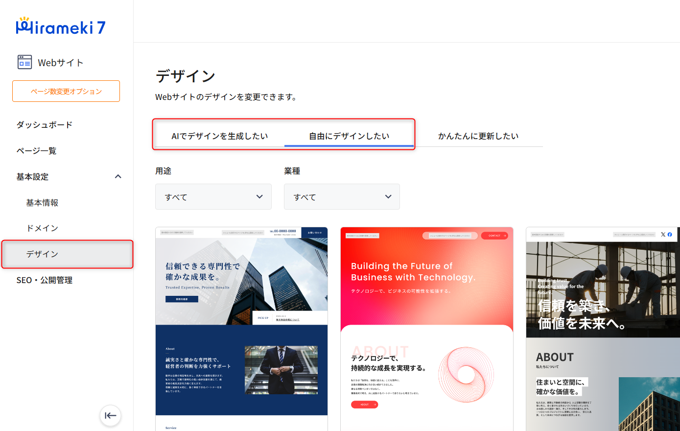 エディターの切替は、Webサイト機能の「デザイン」メニューより行います。