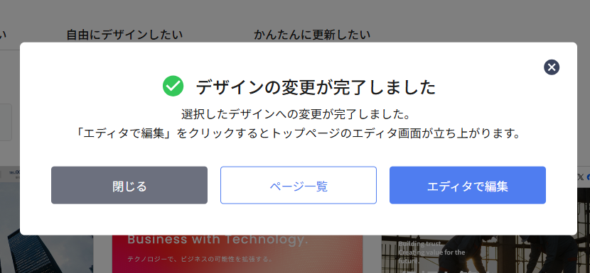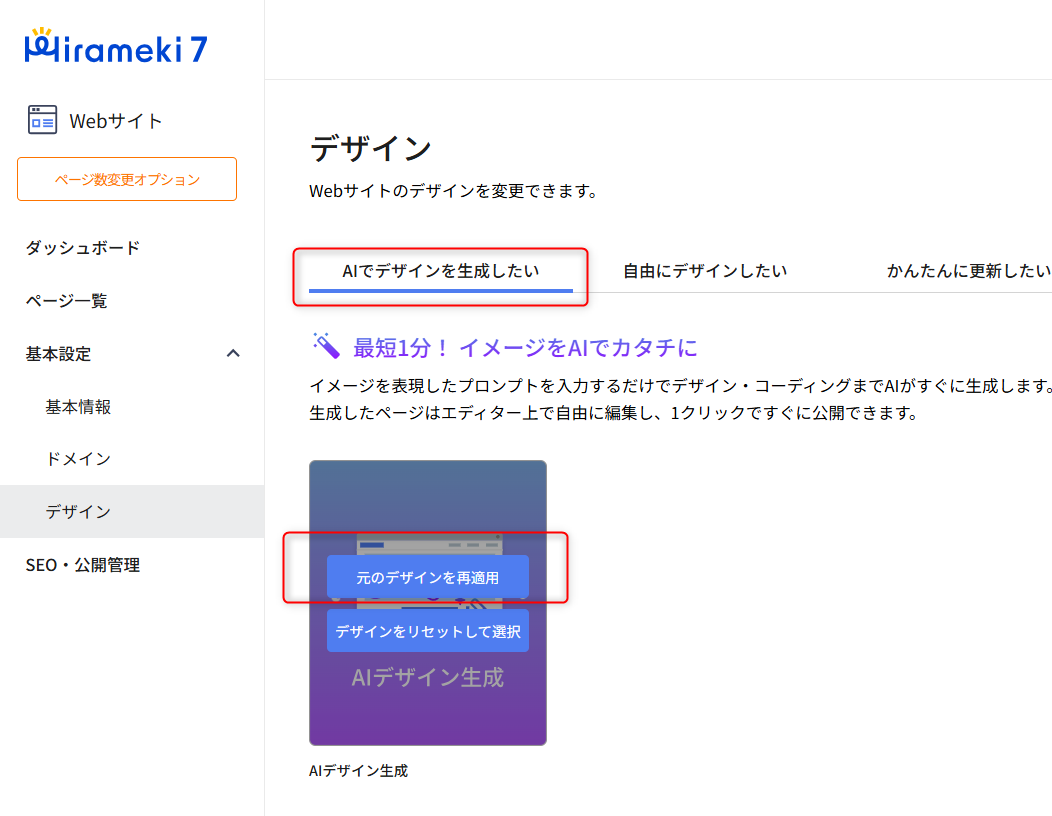 それまで、AIエディターで編集していた内容は保存されますが、再度AIエディターを選択する場合には、「AIでデザインを生成したい」または「自由にデザインしたい」で選択したてプレートより「元のデザインを再適用」ボタンをクリックしてください。