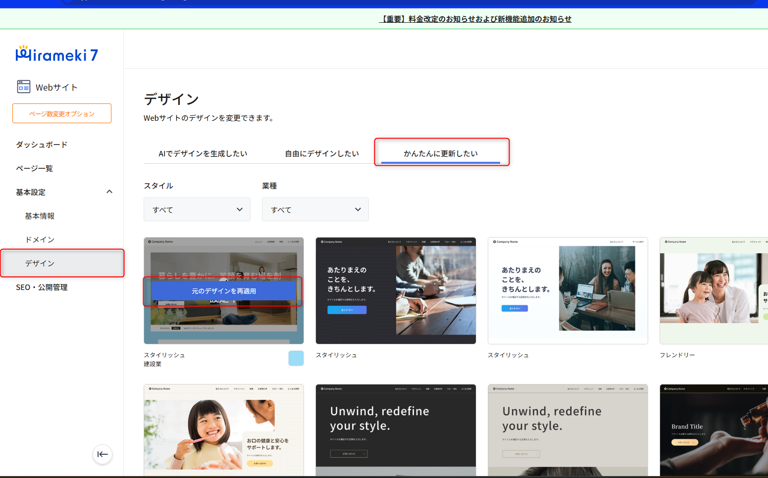 AIエディターを使ってページ編集を行ったものの、やっぱり以前の方が良いと思った場合もかんたんに戻すことができます。公開後でも、公開前でも「デザイン」から「かんたんに更新したい」を開き、一番左上に表示されるテンプレートの上にマウスを移動させると「元のデザインを再適用」ボタンをクリックします。