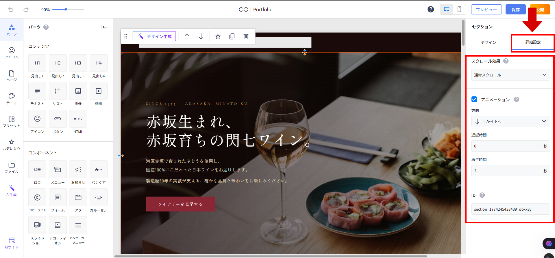セクションをクリックして選択している状態で、右の設定画面の「詳細設定」のタブをクリックすると、アニメーションの設定が表示されます。
