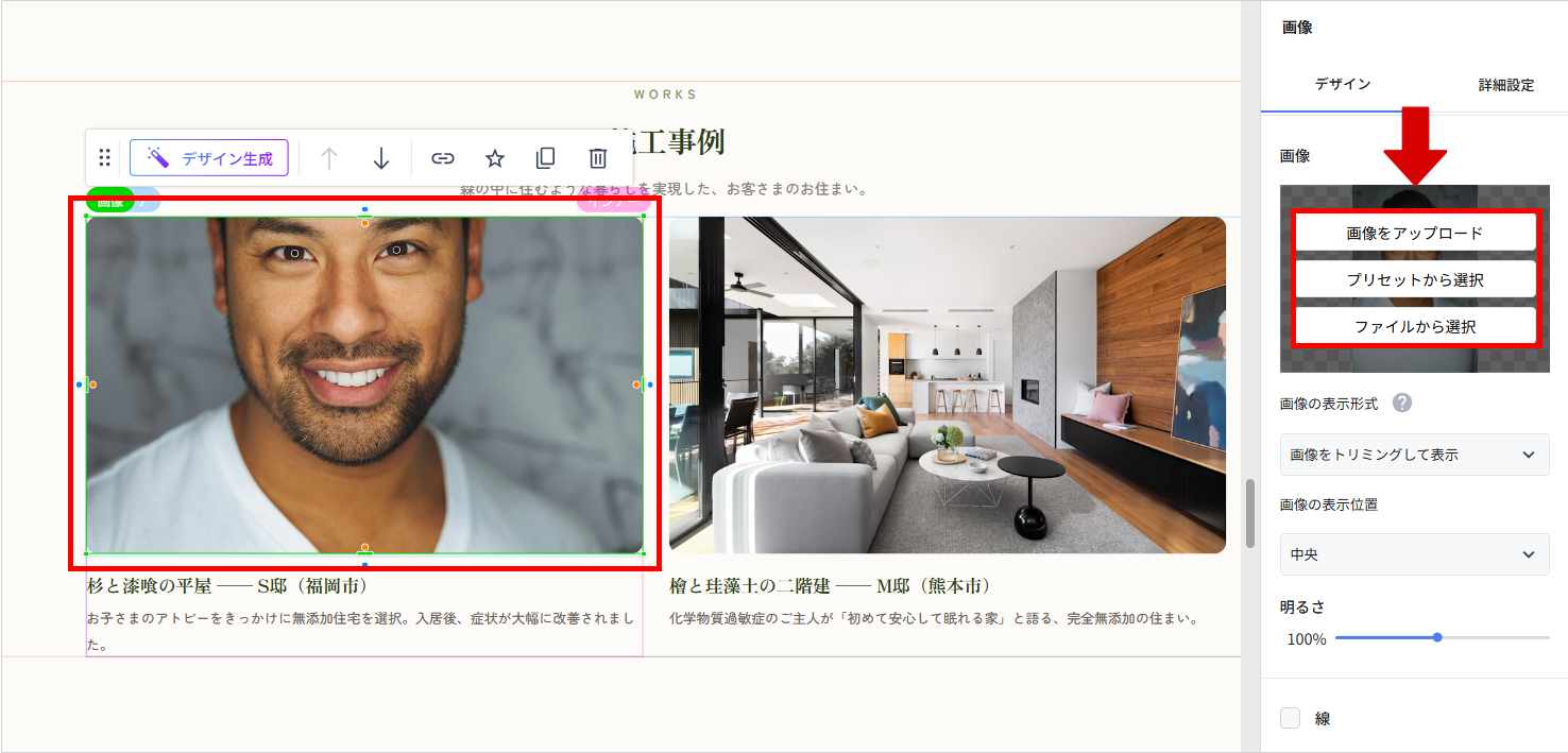 👉画像パーツを選択した状態で、画面右の設定画面から画像を変更します。