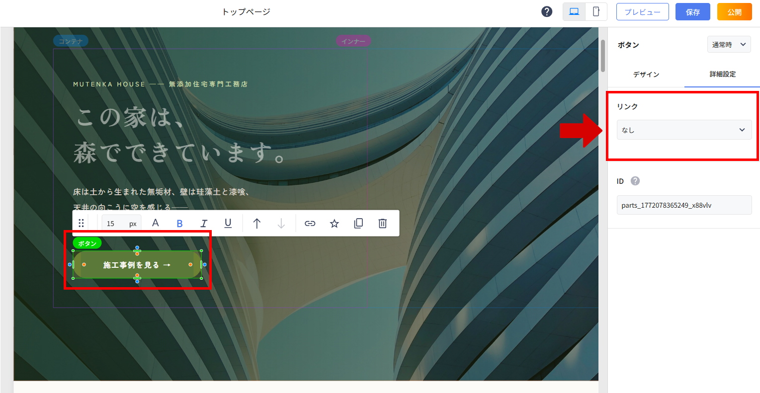 👉ボタンパーツを選択した状態で、画面右の設定画面からリンクを設定します。
